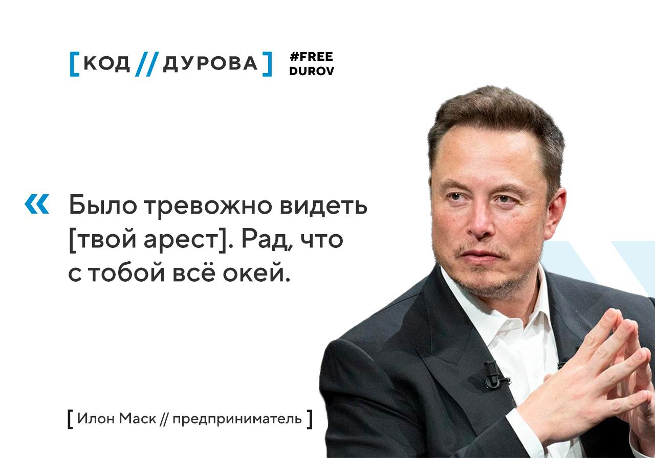 Глава X (экс-Twitter), Tesla и SpaceX отреагировал на публикацию Павла Дурова с объяснением событий во Франции, выразив свою радость за то, что сейчас с ним «всё окей».