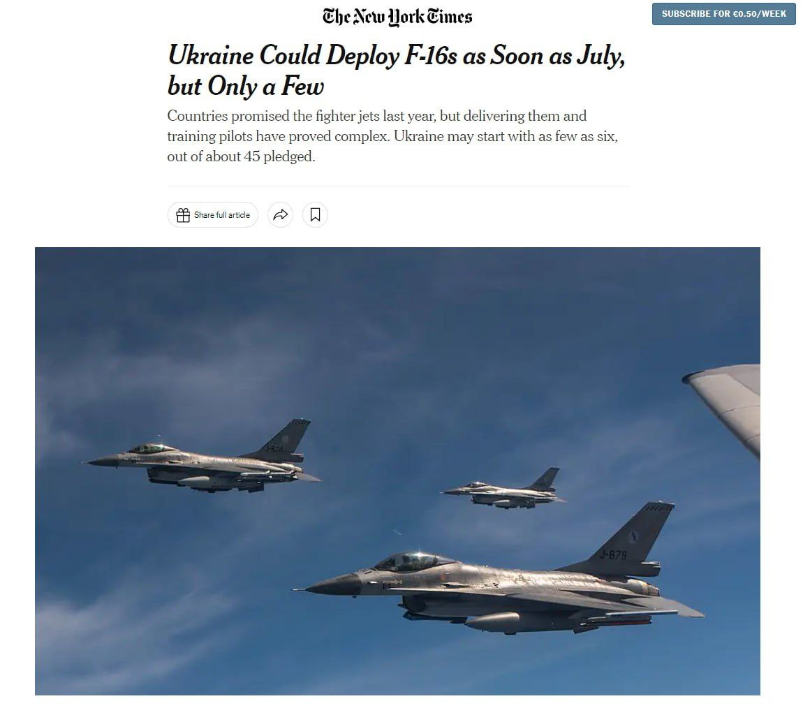 По данным издания, 12 пилотов — меньше, чем полная эскадрилья — к этому лету будут готовы управлять F-16 после 10 месяцев обучения в Дании, Великобритании и США. Тем не менее, к этому моменту Киев, возможно, получит всего лишь шесть из обещанных 45 истребителей.