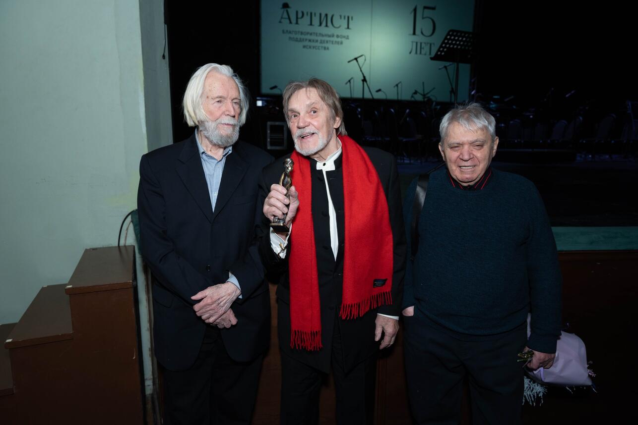 На сцене из рук Евгения Витальевича премию и статуэтку в виде Чарли Чаплина (символ фонда) получил легендарный артист — коллега и партнер Миронова по МХТ Чехова и Театру Наций Станислав Любшин. Зал приветствовал любимого артиста стоя. А Станислав Андреевич сказал: