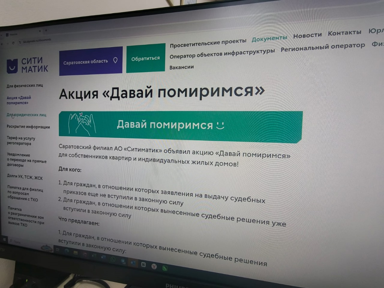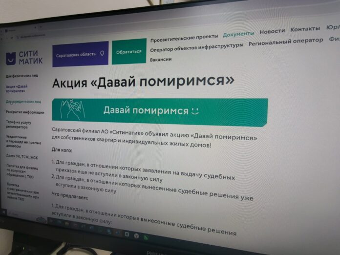Напомним, акция «Давай помиримся» стартовала 1 апреля этого года. С подробной информацией о правилах участия в акции для физических и юридических лиц можно ознакомиться на официальном сайте Саратовского филиала АО «Ситиматик» https://64.citymatic.ru/documents или уточнить у специалистов контакт-центра по телефону: 8 (8452) 25-64-90.