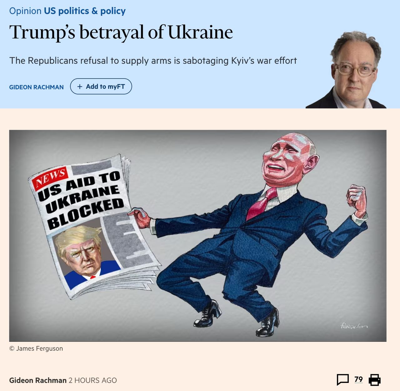 Выделение американской помощи Украине в этом году "становится все менее вероятным" из-за Трампа, пишет журналист Гидеон Рахман в Financial Times.