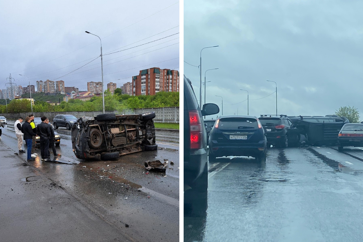 Машина перевернулась на Дубровинского недалеко от Николаевского моста. Движение со стороны Студгородка в центр города оказалось почти заблокировано — автомобиль лег на бок поперек дороги. Уже собралась довольно большая пробка.