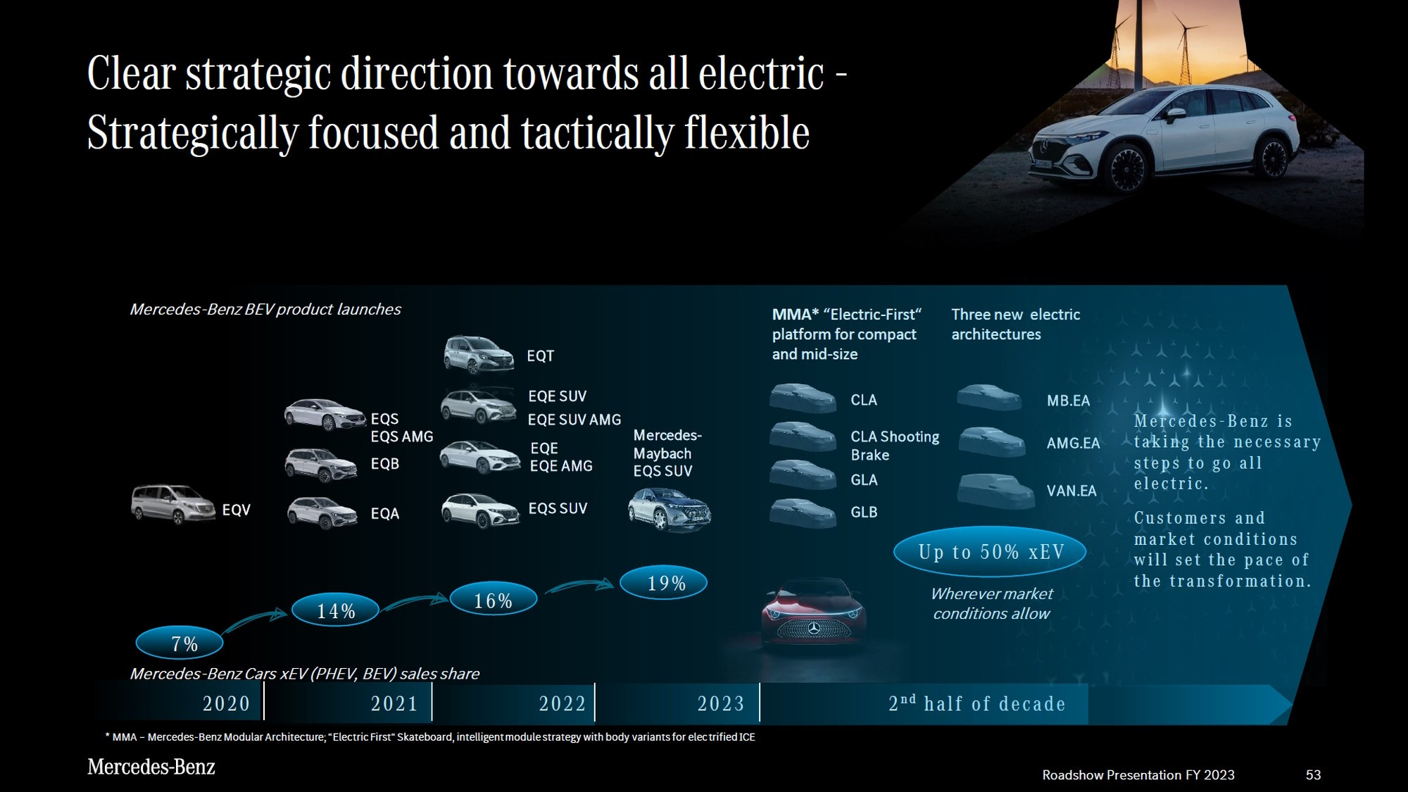 Летом 2021 года компания Mercedes-Benz объявила о том, что к 2030 году её продуктовая линейка будет состоять исключительно из электромобилей на тех рынках, где это будет возможно и востребовано (Европа, Северная Америка, Япония и др.). Осенью того же года стало известно о том, что немецкая компания остановила работу на новыми plug-in гибридами, которые всегда считались мостиком на пути между традиционными автомобилями с ДВС и электромобилями.