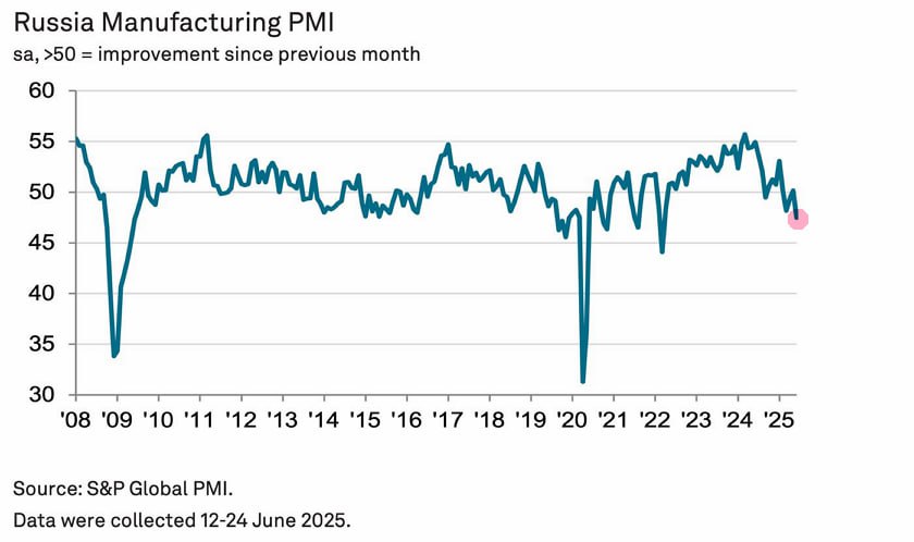 Любой экономист знает, что падение PMI ниже уровня 50 предсказывает рецессию в среднем за два месяца, а падение ниже 44 всегда предсказывает абсолютное снижение экономической активности.