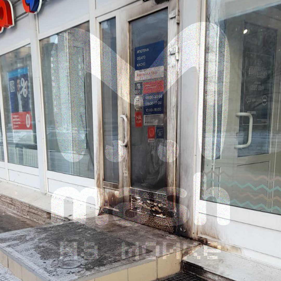 Неизвестный поджёг дверь Совкомбанка на проспекте Ветеранов. Фаер-шоу устроили вчера вечером с помощью пластиковой бутылки с горючим.