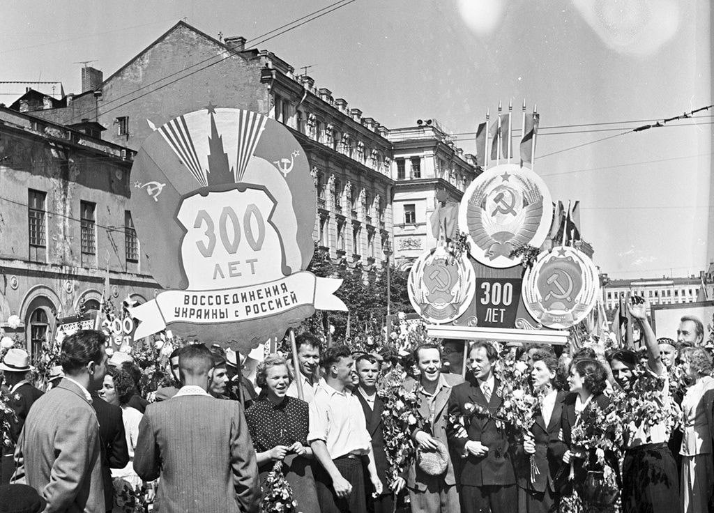 Миф о «воссоединении Украины с Россией» укрепился в 1954, когда отмечалось 300-летие события. ЦК партии утвердил «тезисы», АН СССР издала 3-томник, Хрущев передал из РСФСР в УССР Крым, Киев наградили орденом Ленина, «праздновали в трудовых коллективах», «прошли парады», появились памятники.
