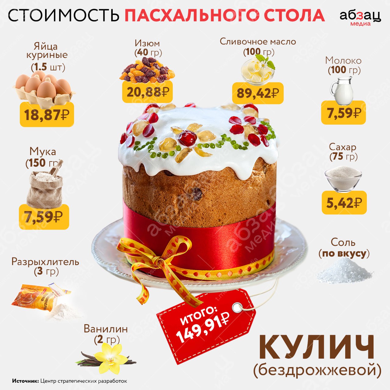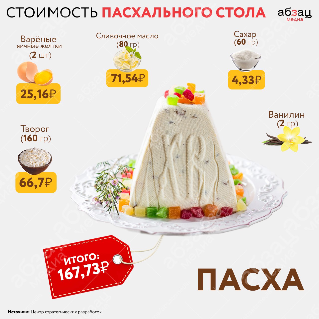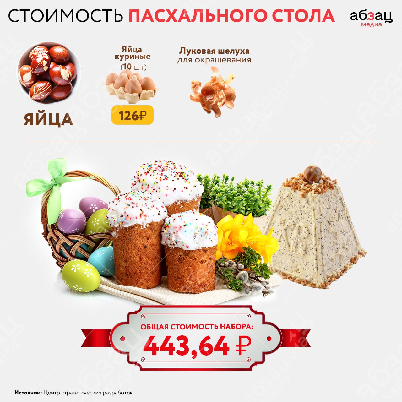 В 2024-м православную Пасху будут отмечать 5 мая. По данным Центра стратегических разработок, набор продуктов для основных блюд праздничного стола в этом году обойдётся в среднем в 443,4 рубля. Речь идёт о приготовлении кулича, пасхи и десяти окрашенных яиц.