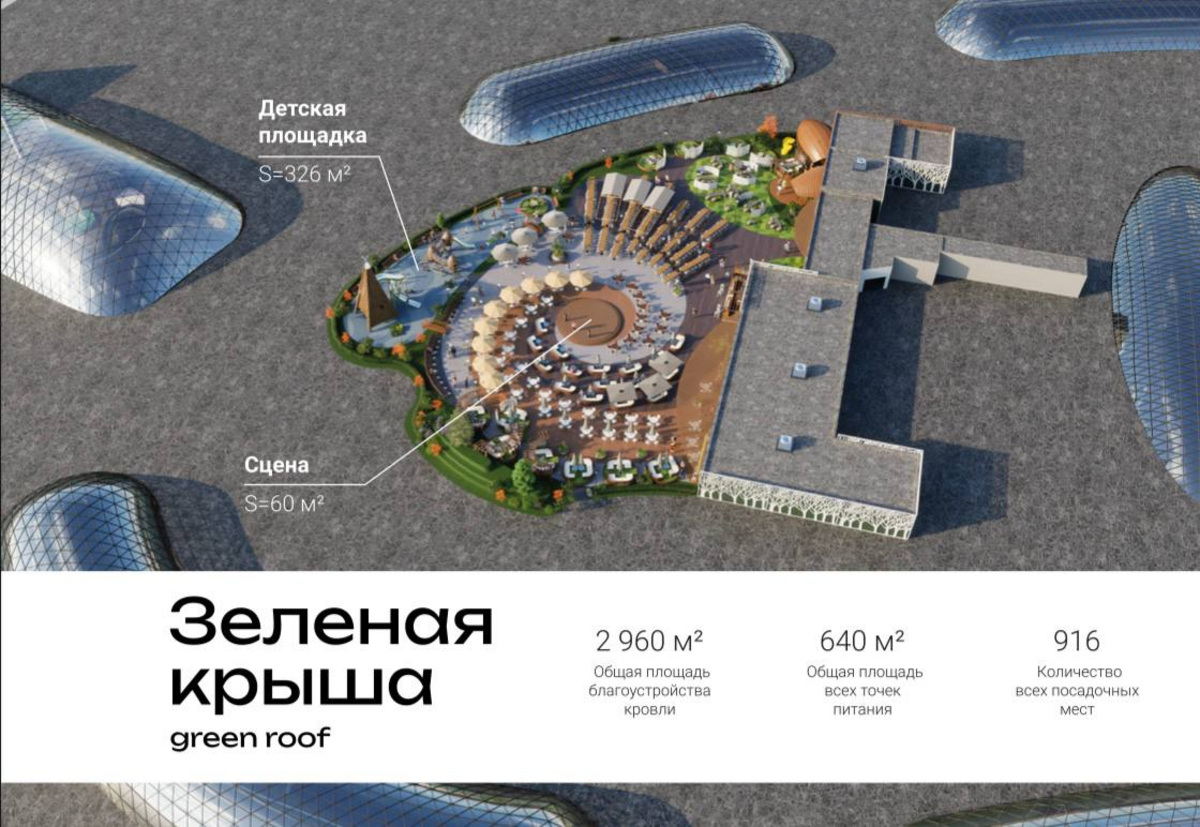 По прогнозам авторов проекта, к концу первого года работы торговый центр будет ежемесячно принимать 1,3 миллиона посетителей. Помимо кинотеатра, в комплексе разместится гастрохаб площадью 16 тысяч квадратных метров с 19 ресторанами, а на эксплуатируемой крыше оборудуют детскую площадку и сцену с 916 посадочными местами.