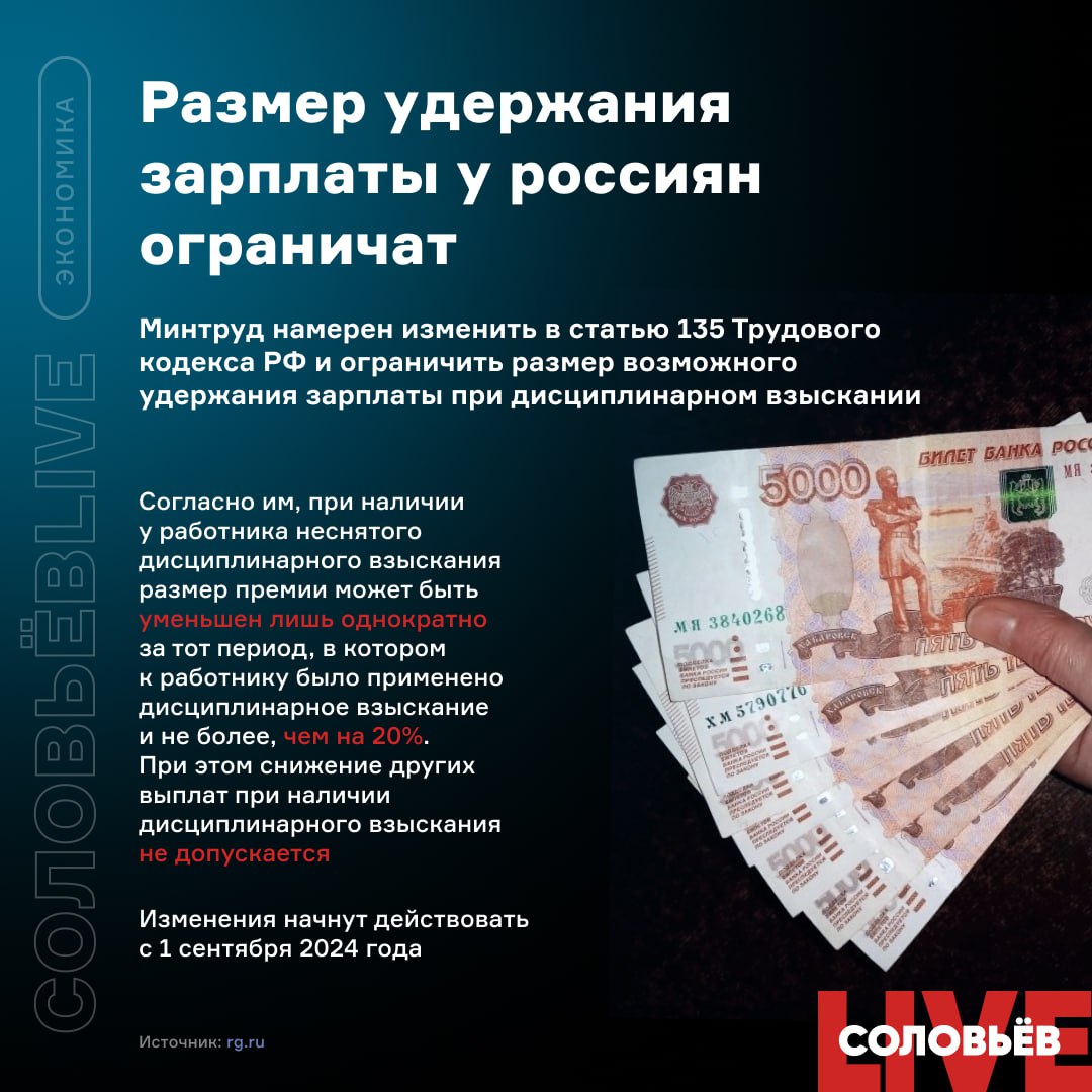 ❗️Министерство труда и социальной защиты РФ намерено ограничить размер возможного удержания зарплаты при дисциплинарном взыскании