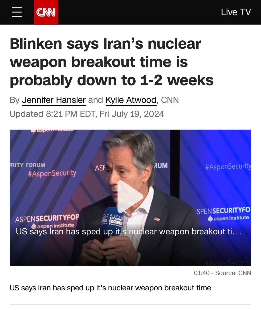 ‼️‼️‼️CNN: Иран «в течение пары недель» способен произвести расщепляемый материал для применения его в ядерном оружии, заявил госсекретарь США.