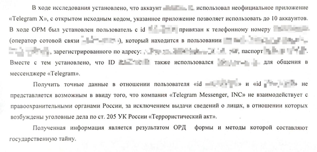«Получить точные данные в отношении пользователя <...> не представляется возможным в виду того, что компания „Telegram Messenger, INC“ не взаимодействует с правоохранительными органами России, за исключением выдачи сведений о лицах, в отношении которых возбуждены уголовные дела по ст. 205 УК России „Террористический акт“».