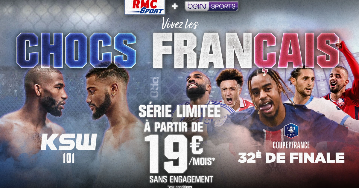 - RMC SPORT + beIN SPORTS 100% digital : 19€/mois (au lieu de 35€) pendant 6 mois, engagement 6 mois