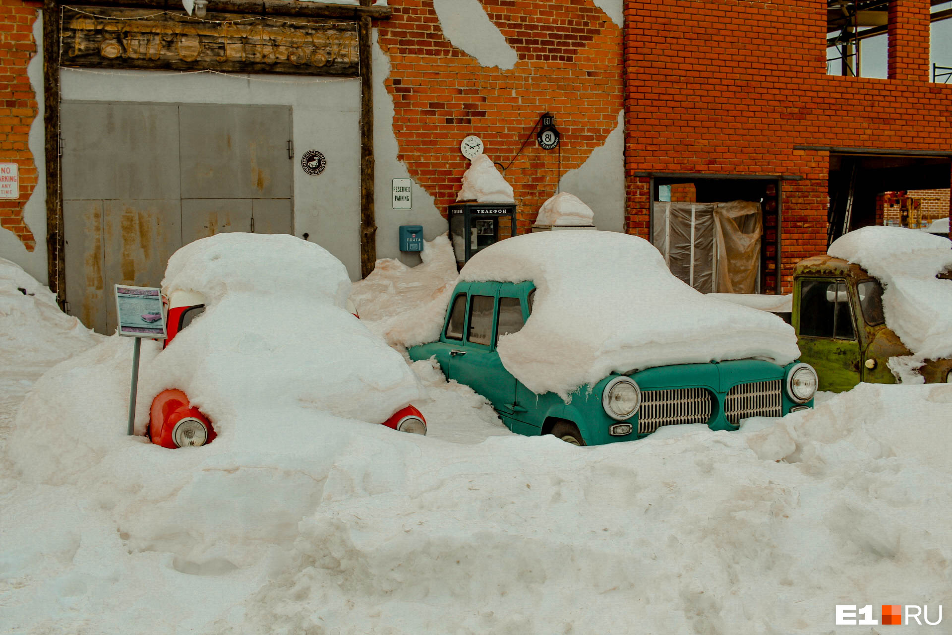 Пока на улице была зима, машины во дворе превратились в подснежники. Рассмотреть их сложно, но можно. Большой плюс: за экспозицию под открытым небом платить не нужно. У каждой машины здесь есть карточка под лобовым или боковым стеклом.