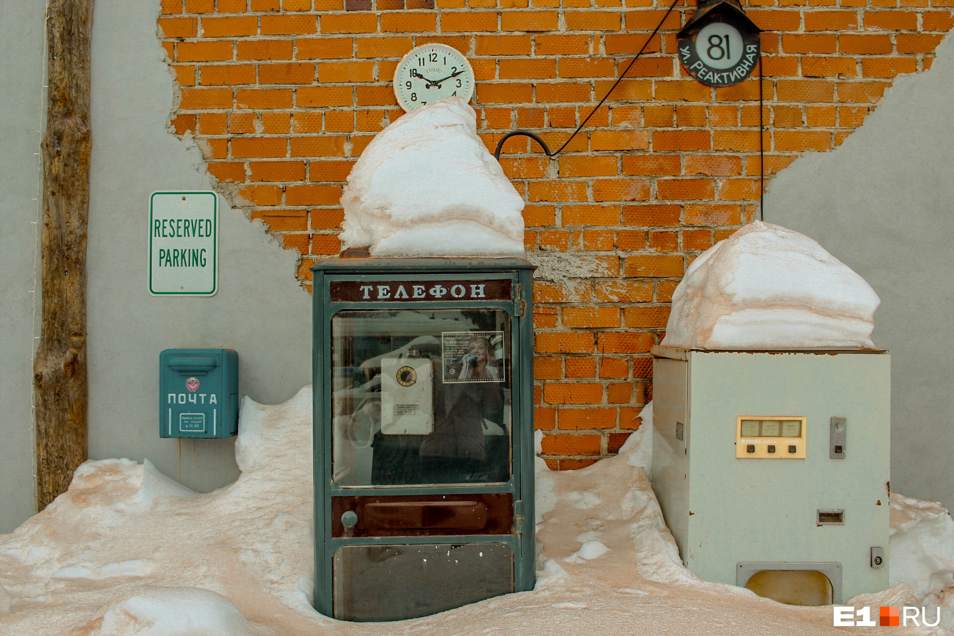 Заинтересовали советский автомат и телефонная будка — сразу вспоминаешь серию «Ну, погоди!», где волк пытался выманить зайца. Правда, эти автоматы пока тоже под снегом.