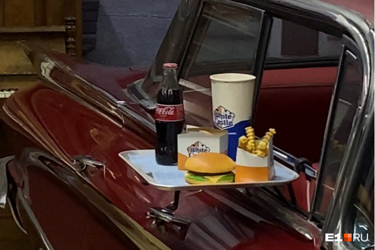 К окошку прикреплен поднос с фастфудом. Это напомнило мне фильм «Основатель», который рассказывает историю фирмы «Макдональдс». Там есть несколько сцен, в которых официанты выносили к автомобилям еду и ставили ее на такие столики.