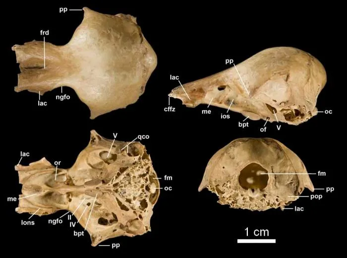 Ученые обнаружили у талпанаса незаурядные особенности строения. Во-первых, объем его черепной коробки был сравнительно небольшим из-за укороченной формы самой черепушки. Во-вторых, у утки были маленькие и широко расставленные глазницы. Плюс отверстия для зрительных нервов оказались крайне узкими. А в сумме это означает, что зрение у птицы было хуже, чем у близорукого школьника с первой парты.