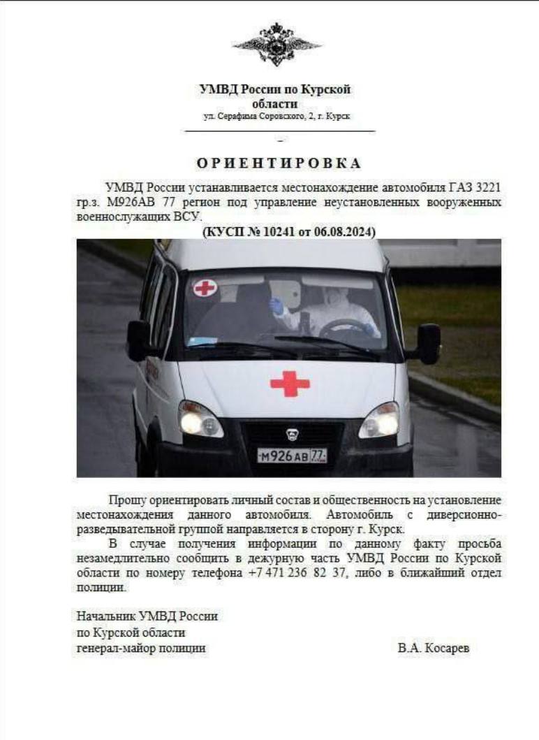 В курских и белгородских пабликах распространяется ориентировка на автомобиль скорой помощи «под управлением неустановленных вооружённых военнослужащих ВСУ». Но это фейк.