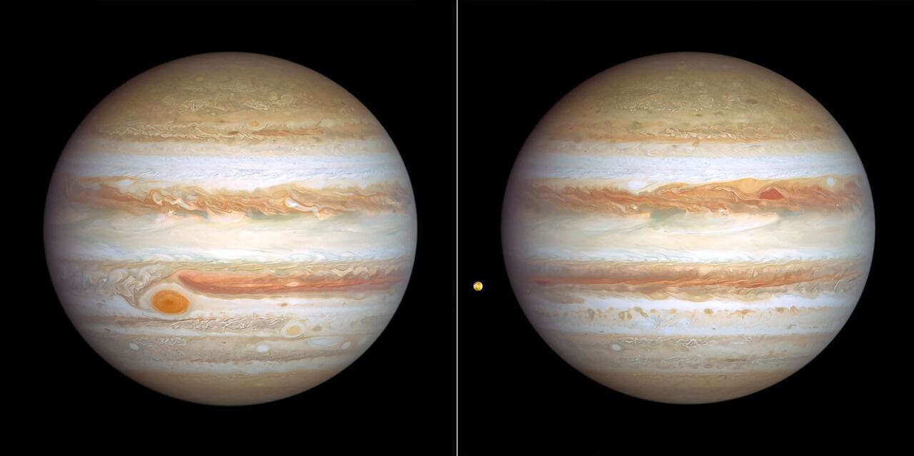 — На левом изображении можно заметить Большое Красное Пятно, которое настолько гигантское, что способно поглотить нашу планету.