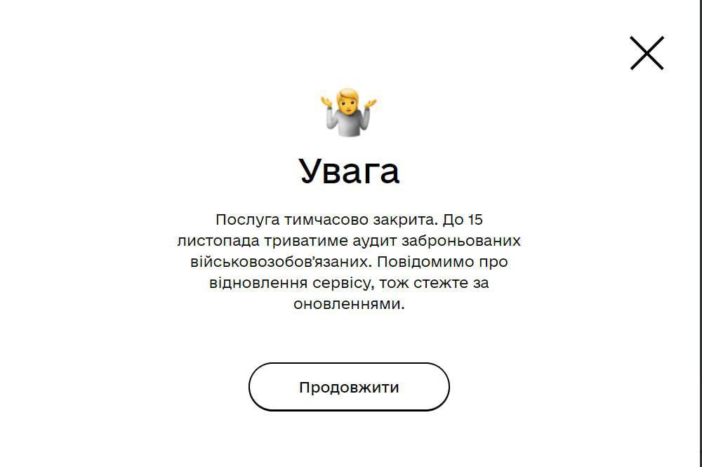 ΠΠ°ΠΊ Π·Π°ΠΌΠ΅ΡΠΈΠ»ΠΈ ΡΠΊΡΠ°ΠΈΠ½ΡΠΊΠΈΠ΅ ΠΏΠΎΠ»ΡΠ·ΠΎΠ²Π°ΡΠ΅Π»ΠΈ, Π½Π° ΠΏΠΎΡΡΠ°Π»Π΅ Β«ΠiΡΒ» (ΡΠΊΡΠ°ΠΈΠ½ΡΠΊΠΈΠΉ Π°Π½Π°Π»ΠΎΠ³ Β«ΠΠΎΡΡΡΠ»ΡΠ³Β») Π½Π΅Π΄ΠΎΡΡΡΠΏΠ½Π° ΡΠΎΡΠΌΠ° Π·Π°ΡΠ²ΠΊΠΈ Π½Π° Π±ΡΠΎΠ½Ρ ΠΎΡ ΠΌΠΎΠ±ΠΈΠ»ΠΈΠ·Π°ΡΠΈΠΈ. ΠΠ° ΡΠΎΠΎΡΠ²Π΅ΡΡΡΠ²ΡΡΡΠ΅ΠΉ ΡΡΡΠ°Π½ΠΈΡΠ΅ Π³ΠΎΠ²ΠΎΡΠΈΡΡΡ, ΡΡΠΎ Π±ΡΠΎΠ½ΠΈΡΠΎΠ²Π°Π½ΠΈΠ΅ Π±ΡΠ»ΠΎ ΠΏΡΠΈΠΎΡΡΠ°Π½ΠΎΠ²Π»Π΅Π½ΠΎ Π΄ΠΎ 15 Π½ΠΎΡΠ±ΡΡ ΠΈΠ·-Π·Π° Β«Π°ΡΠ΄ΠΈΡΠ° Π·Π°Π±ΡΠΎΠ½ΠΈΡΠΎΠ²Π°Π½Π½ΡΡ Π²ΠΎΠ΅Π½Π½ΠΎΠΎΠ±ΡΠ·Π°Π½Π½ΡΡ Β».