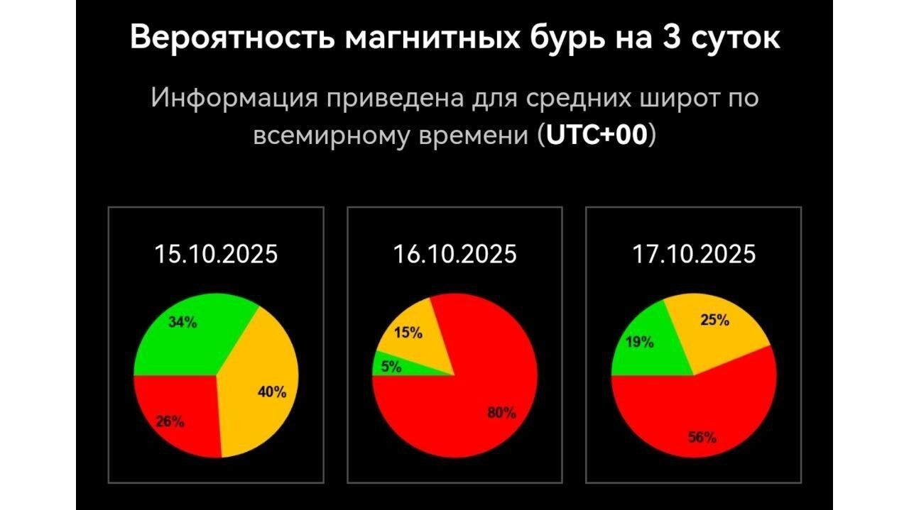 Вероятность шторма 16 октября — 80%, перехода магнитосферы в желтую зону — 15%. При этом основную активность ученые прогнозируют все же на самый конец недели.