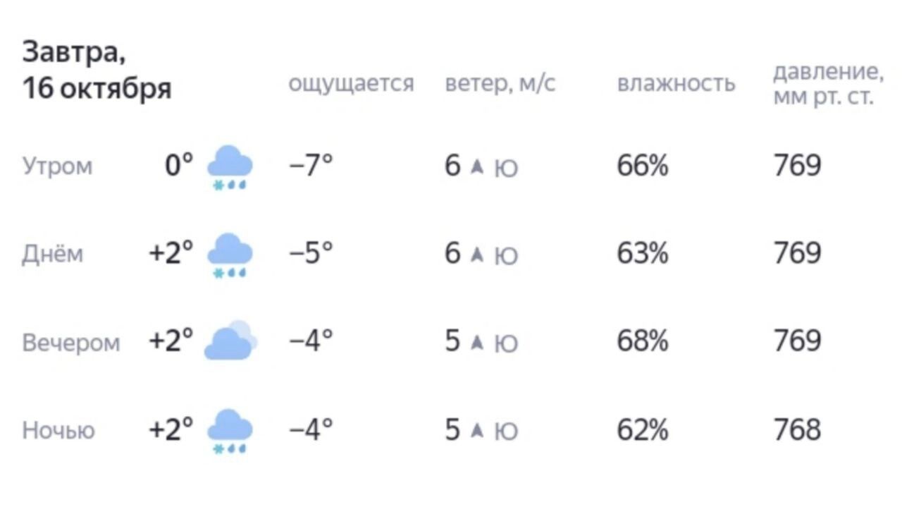 В четверг, 16 октября, средние температуры в Югре составят 0…+5 градусов днем, и -6…-1 градус — ночью. В восточной части возможно ночное похолодание до -15 градусов и порывы ветра до 14 м/с. Также прогнозируют дождь и мокрый снег — как небольшой, так и умеренный. Ветер — южный, 5-12 м/с.