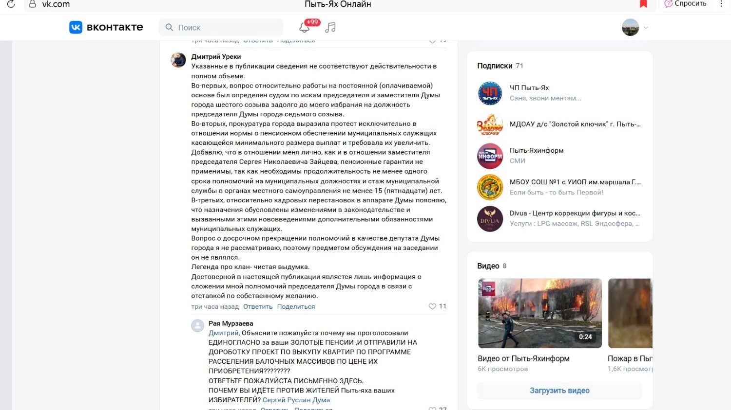 «Вопрос о досрочном прекращении полномочий в качестве депутата Думы города я не рассматриваю, поэтому предметом обсуждения на заседании он не являлся. Легенда про клан — чистая выдумка. Достоверной в настоящей публикации является лишь информация о сложении мной полномочий председателя Думы города в связи с отставкой по собственному желанию», — написал Дмитрий Уреки.