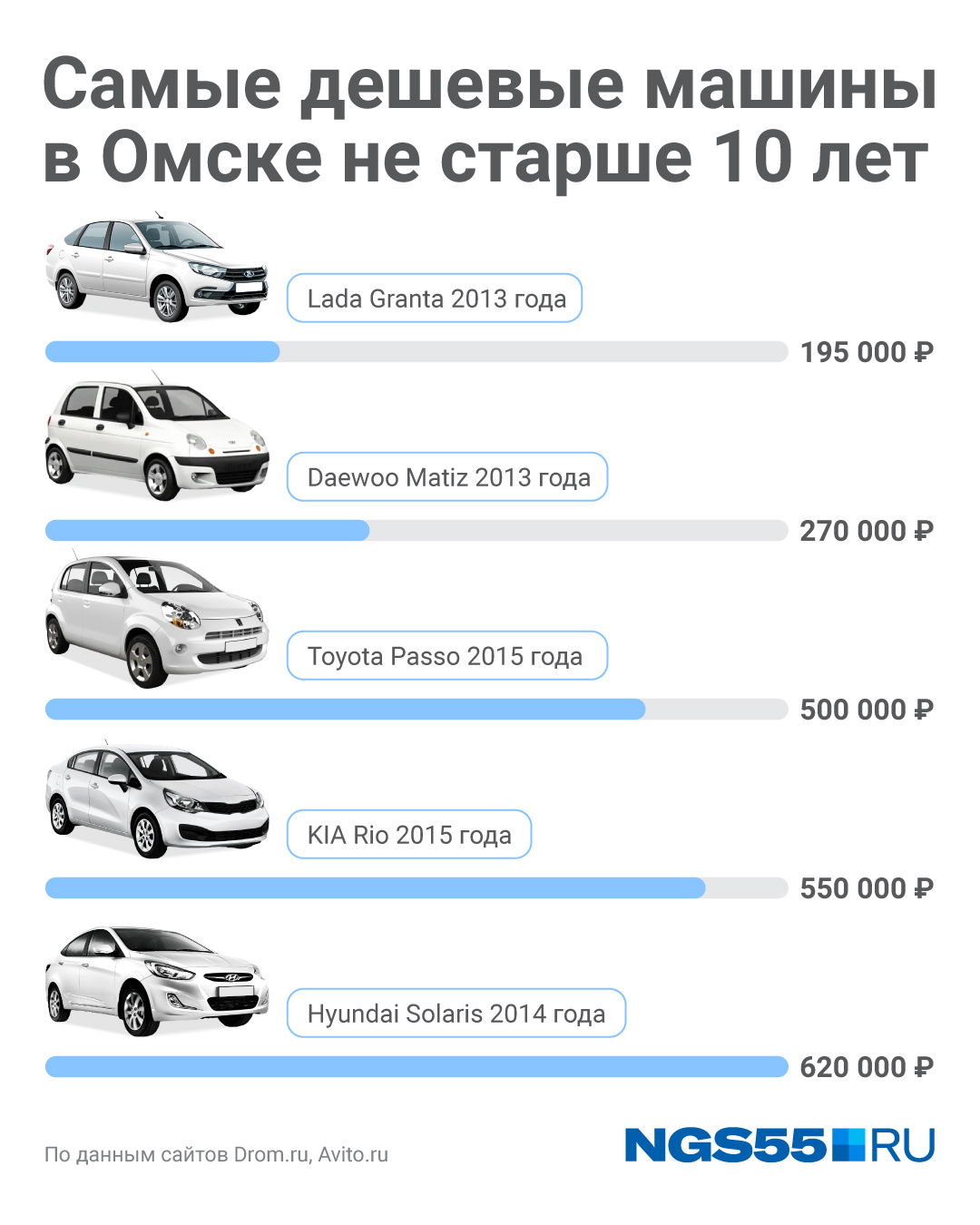 На сайтах Drom и Avito корреспондент NGS55.RU посмотрел цены на недорогие автомобили не старше 10 лет, которые продаются в Омске. Суммы стартуют от 195 тысяч рублей, и, конечно, все дешевые авто — на механике. За эту стоимость продавец отдает Lada Granta 2013 года с пробегом 260 тысяч км. «Четырнадцатую» Lada этого же года можно купить за 250 тысяч рублей с пробегом 182 тысячи км. А в среднем машины этой отечественной марки продают в пределах 400–450 тысяч рублей.