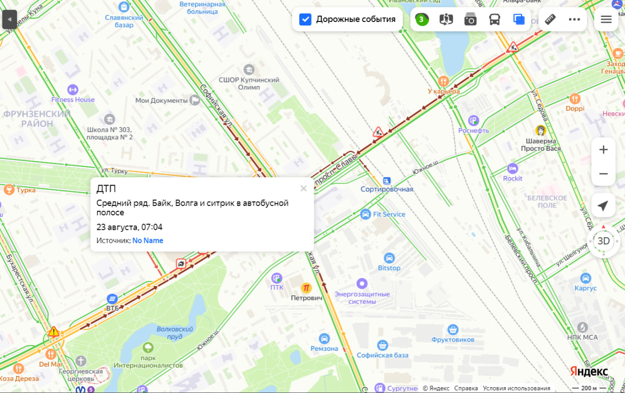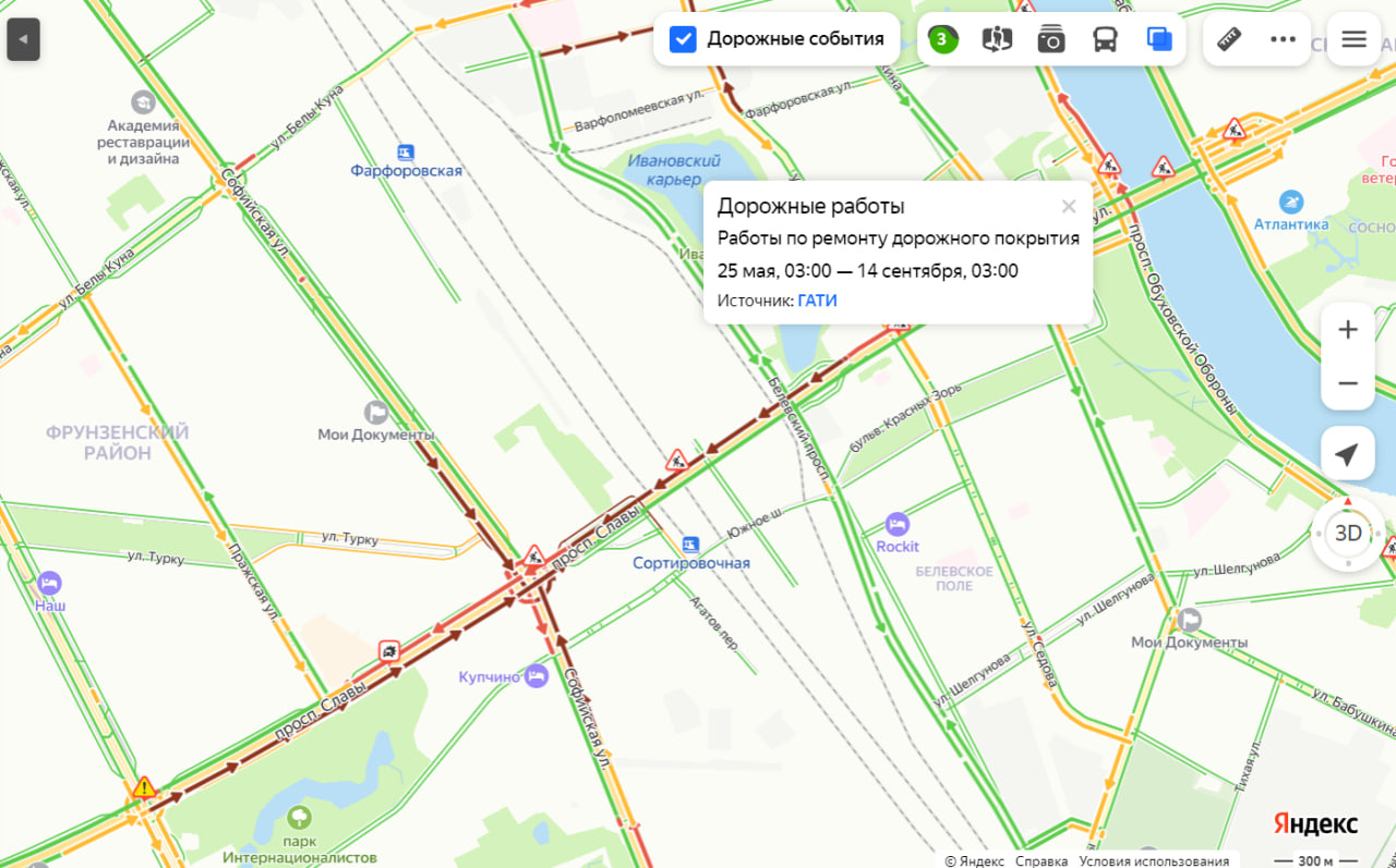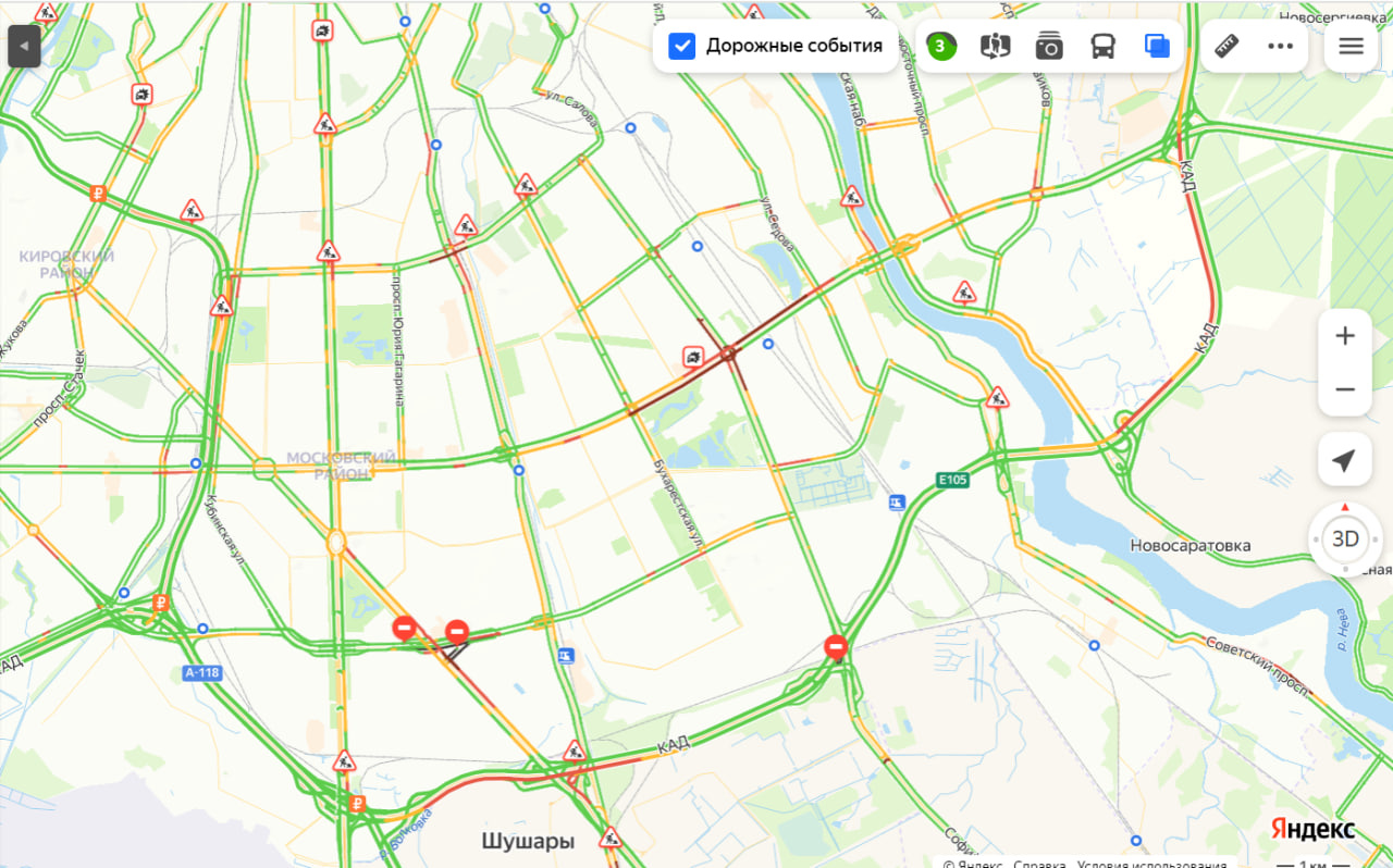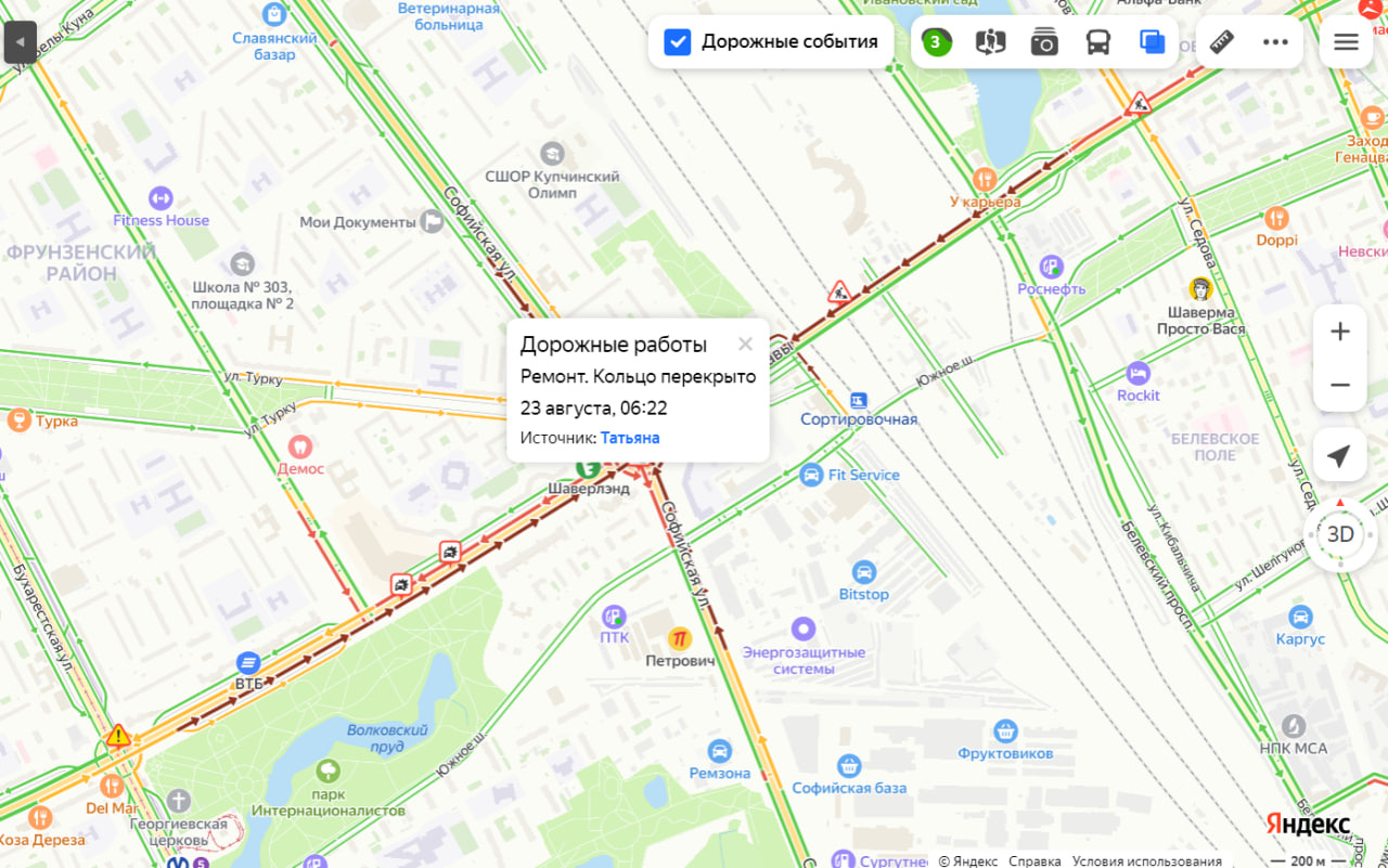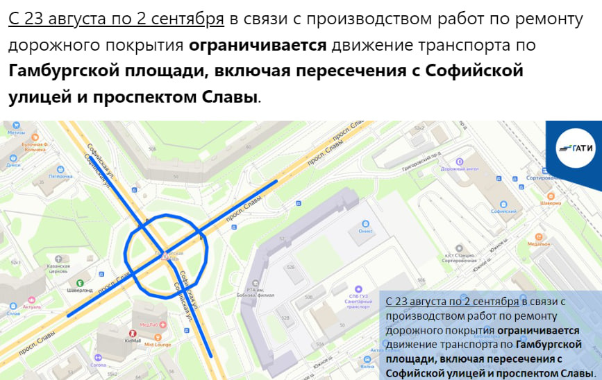 Плотные пробки образовались утром 23 августа на проспекте Славы и Софийской улице перед их пересечением — Гамбургской площадью. На площади сегодня, по данным ГАТИ, начался ремонт дорожного покрытия с ограничением движения, он продлится до