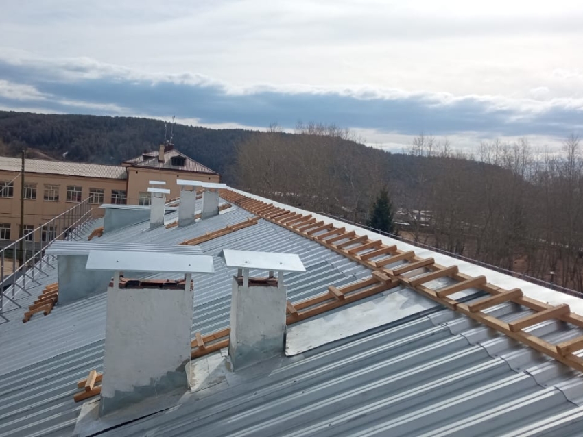 На новой крыше установили слуховые окна, вентиляционные шахты, а также подвесную систему наружного водостока.