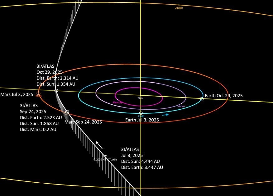 Ожидается, что 3I/ATLAS пройдет необычно близко к Венере, Марсу и Юпитеру этой осенью – совпадение, вероятность которого Леб оценивает всего в 0,005 процента, если время прибытия было случайным.