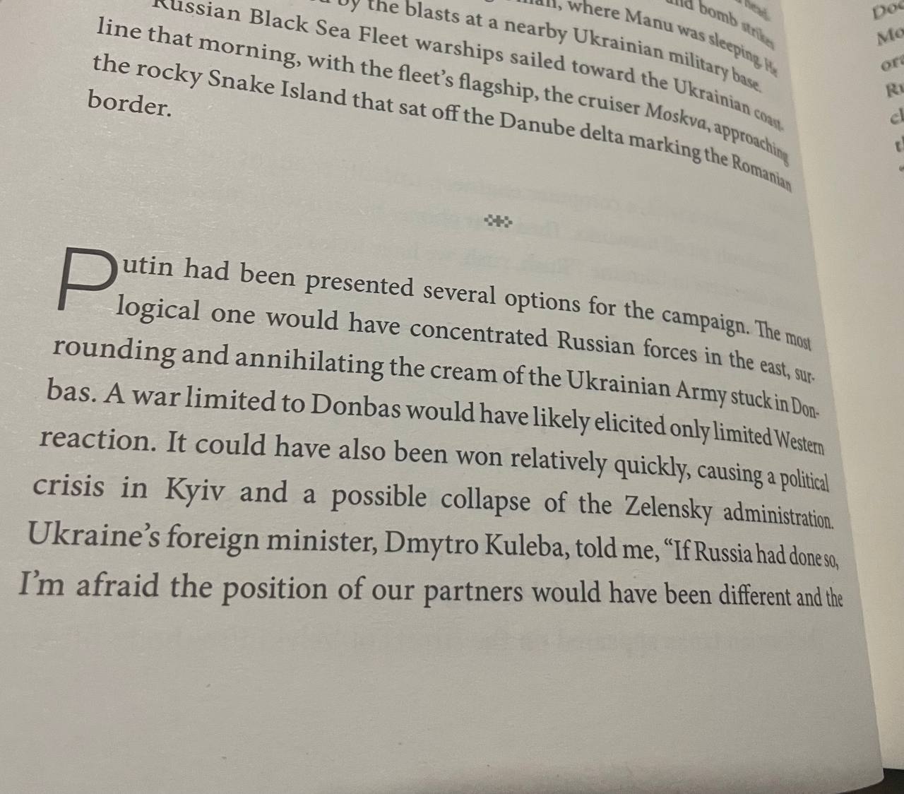«Путину было предложено несколько вариантов кампании. Наиболее логичным вариантом было бы сосредоточить российские силы на востоке, окружив и уничтожив лучшие части украинской армии на Донбассе. Война, ограниченная Донбассом, вероятно, вызвала бы лишь ограниченную реакцию Запада. Её также можно было выиграть относительно быстро, что привело бы к политическому кризису в Киеве и возможному краху администрации Зеленского. Министр иностранных дел Украины Дмитрий Кулеба сказал мне: «Если бы Россия сделала это, я боюсь, что позиция наших партнеров была бы другой, и логика Минского процесса — основанная на идее уступок во избежание большой войны — все равно бы преобладала». Но Путин выбрал иное», - пишет в своей новой книге «Наши враги исчезнут: российское вторжение и война за независимость Украины». Ярослав Трофимов, главный корреспондент Wall Street Journal по международным делам.