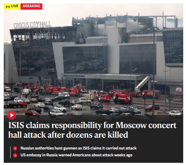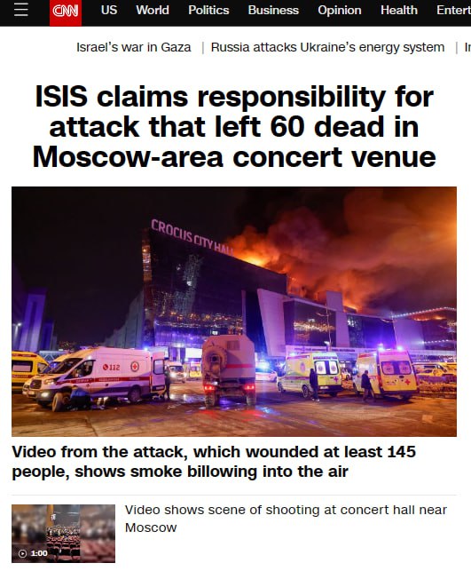 🔺CNN: ИГИЛ* взяло на себя ответственность за нападение на «Крокус». Это была самая масштабная террористическая атака в России за последние годы.