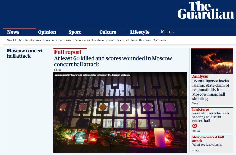 🔺The Guardian: Разведка США подтверждает, что нападение было совершено Исламским государством – Хорасан (ИГ-Х), региональным филиалом террористической организации ИГ. Эта информация расходится с мнением некоторых российских чиновников о причастности Украины.