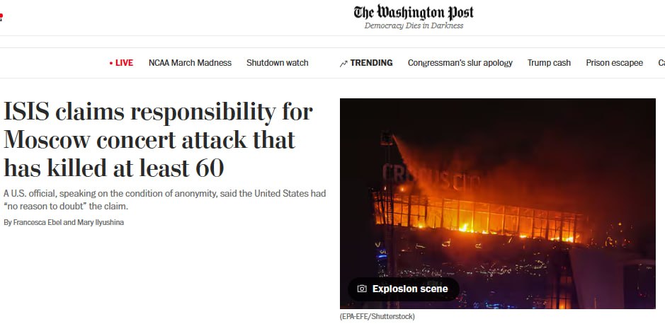 🔺The Washington Post: Вчерашняя атака ИГ-Х в России привела к резкой эскалации ситуации. Многие эксперты утверждают, что в последние годы группировка выступала против Путина. Движение было зациклено на России в течение последних двух лет, часто критикуя Путина в своей пропаганде.