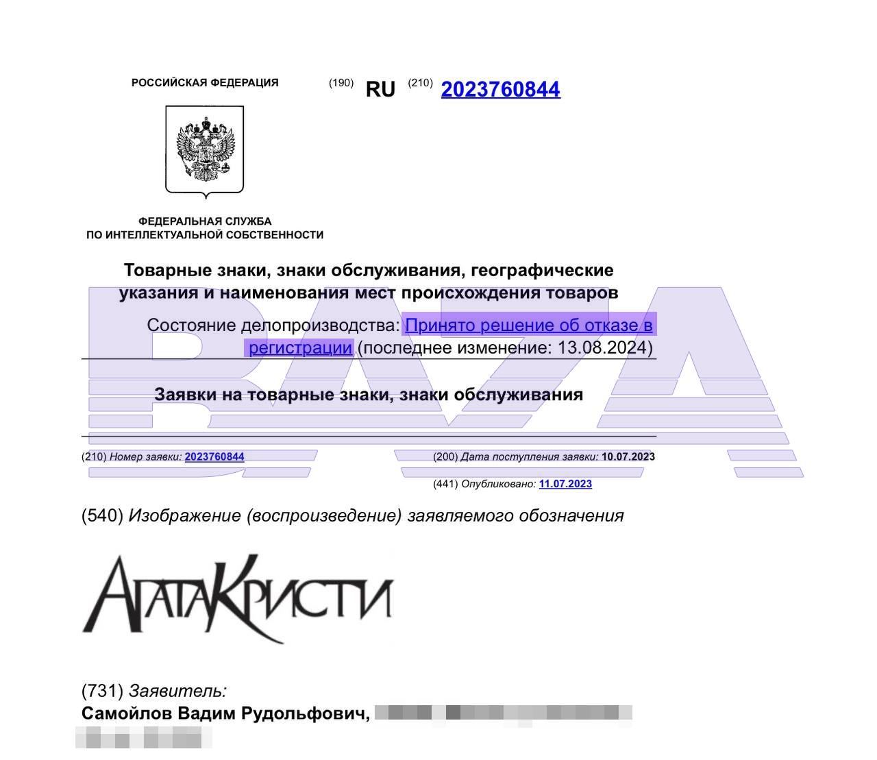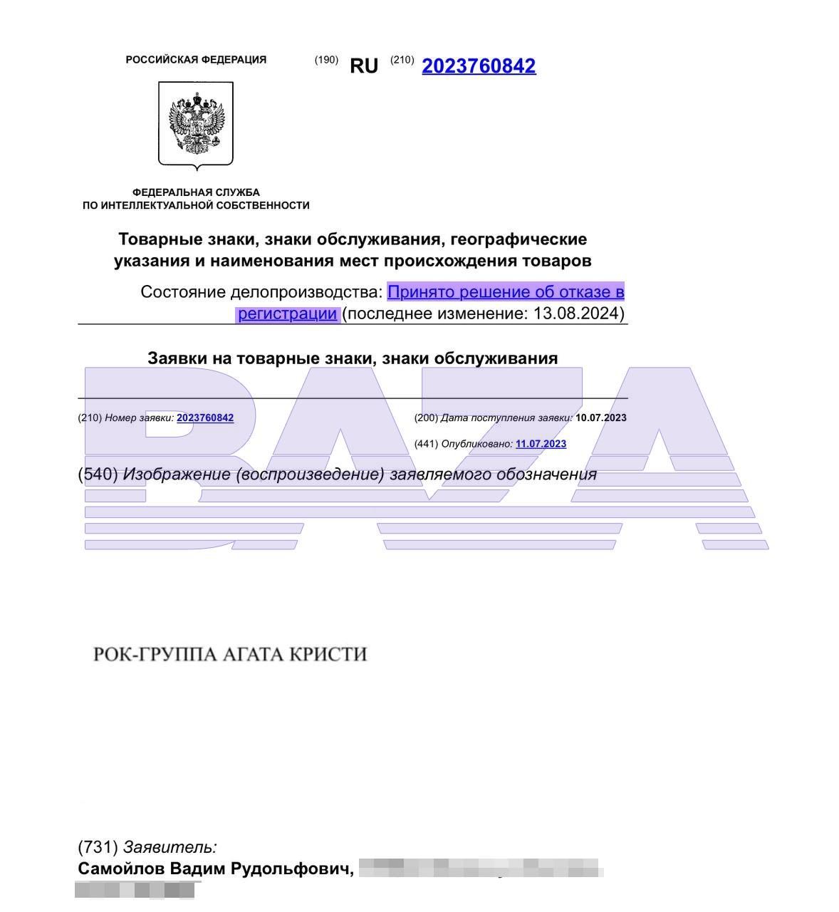 Вадиму Самойлову отказали в регистрации товарного знака «Агата Кристи» и «Рок-группа Агата Кристи». Виновата Агата Кристи.