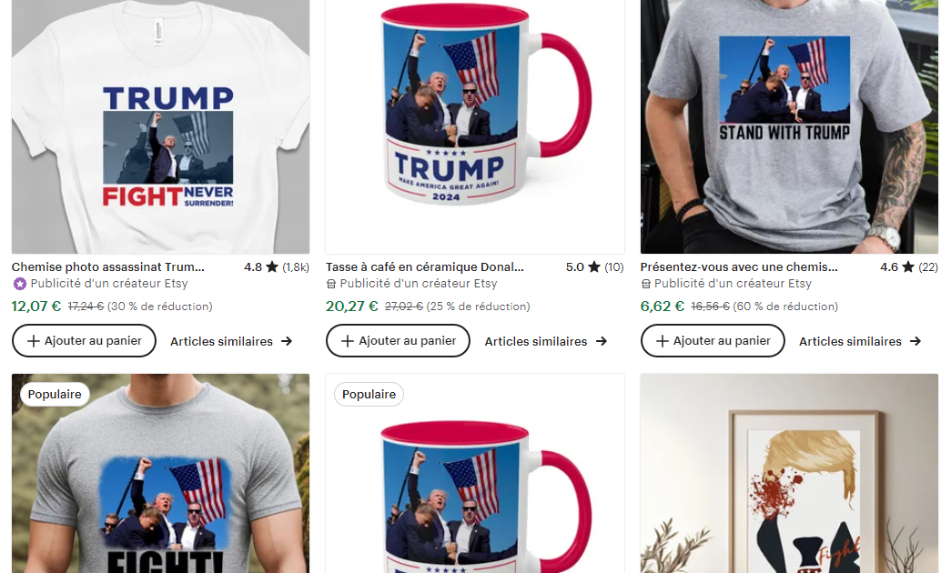 D'autres sites ont rapidement emboîté le pas à Taobao. Sur la plateforme de vente américaine Etsy, qui compte 30 millions d'utilisateurs, on trouve désormais des tasses, des tee-shirts, des affiches ou des pins reprenant le célèbre cliché pris par le photographe Evan Vucci et montrant le poing levé de Donald Trump. Ces produits sont souvent agrémentés de slogans appelant à voter pour le Républicain : «Fight for America, never surrender» (Bats toi pour l'Amérique, ne te rends jamais)», «bulletproof» (pare-balles) ou le mot «fight», (battez-vous), que le candidat avait hurlé à plusieurs reprises juste après avoir esquivé la balle.