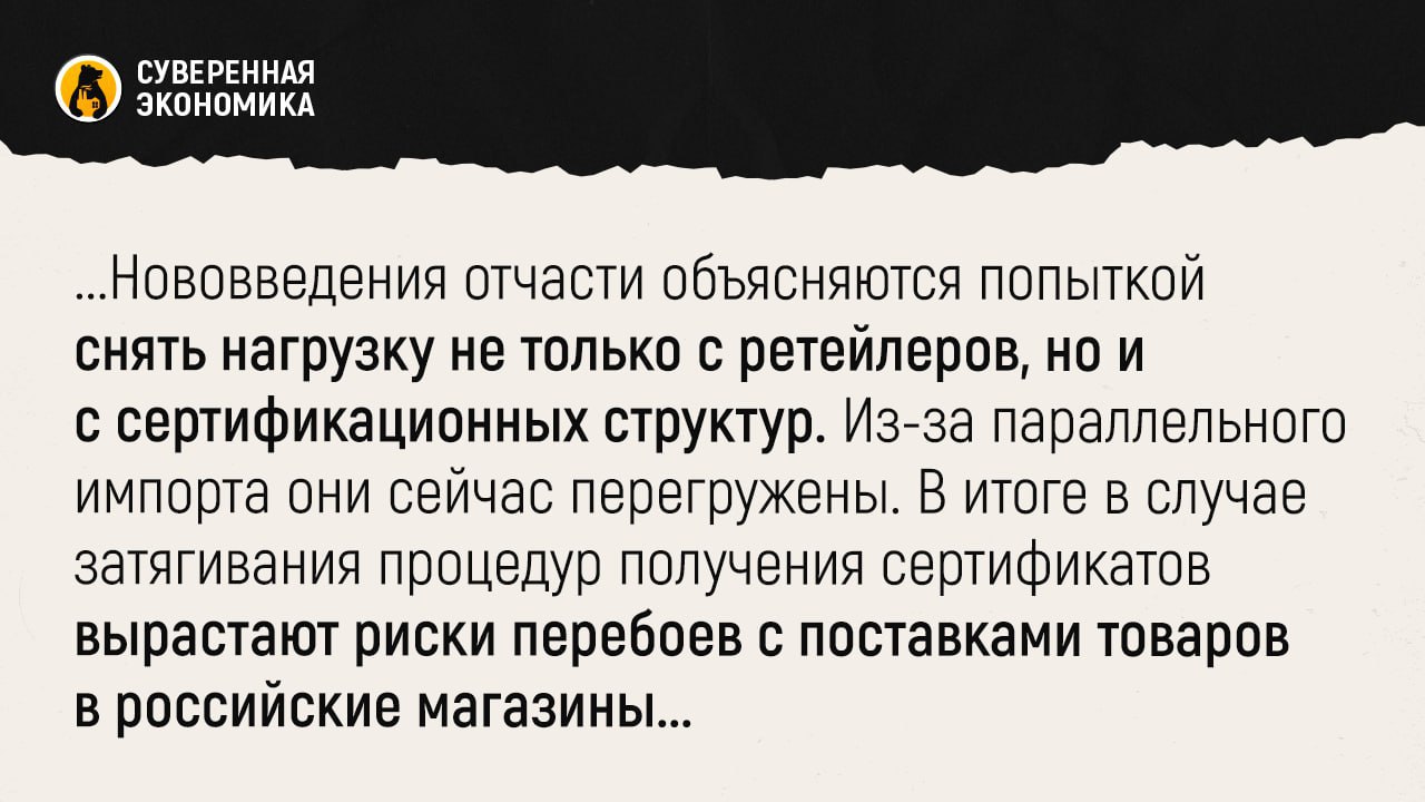 Нововведения отчасти объясняются попыткой снять нагрузку не только с ретейлеров, но и с сертификационных структур. Из-за параллельного импорта они сейчас перегружены. В итоге в случае затягивания процедур получения сертификатов вырастают риски перебоев с поставками товаров в российские магазины.