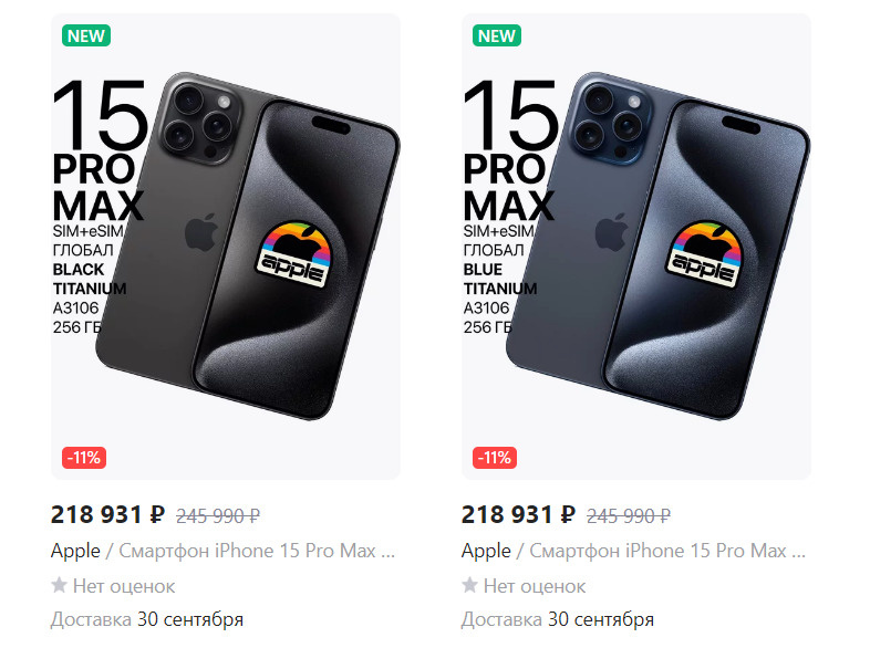 На Wildberries iPhone 15 продается в версии Pro Max на 256 ГБ памяти. Пока только в черном цвете. Стоимость новинки — почти 219 тысяч рублей. На Оzon представлено больше 20 предложений Iphone 15 Pro Max в бежевом, белом, синем и черном цветах. Стоимость варьируется от 267 тысяч 695 рублей с памятью на 256 ГБ до 360 тысяч 359 рублей и 1 ТБ памяти. Ждать новинку на обоих маркетплейсах придется около 6 дней, а о продавцах нет отзывов. На Wildberries еще и указано, что гаджеты представлены в глобал-версии (международная версия, которая произведена для стран Европы и арабского пояса — прим.ред).