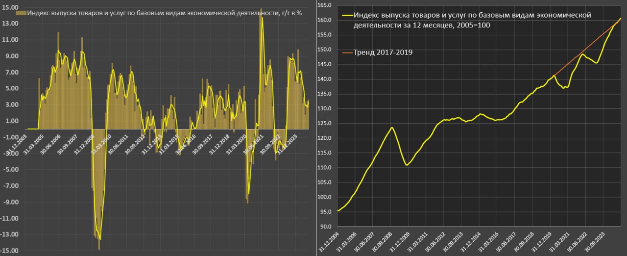 Индекс выпуска вернулся к тренду 2017-2019 в мае 2024 и следует тренду с небольшим опережением, но динамика последнего полугода сигнализирует о замедлении роста к темпам 2.5-3% годовых и исключением сезонного фактора и более выраженное замедление до 1.5-2% SA годовых в последние три месяца по предварительным расчетам.