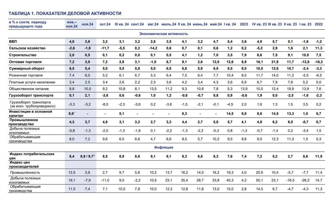 Индекс выпуска товаров и услуг по базовым видам экономической деятельности вырос на 3.7% г/г и на 8.3% к ноя.21, за 11м24 рост на 4.7% г/г и +10.2% за три года (11м24 к 11м21).