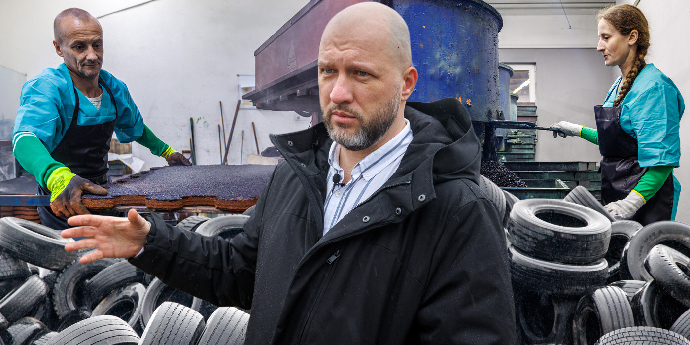 Владелец компании «ЭкоРан Про», которая выпускает резиновую плитку для детских площадок и спортивных сооружений, встречает нас у огромной горы изношенных автомобильных шин. Их на утилизацию сдают юрлица. Просто так взять и выбросить ненужные покрышки нельзя — выручает компания Дмитрия Кулакова, у которой есть лицензия на переработку отходов третьего класса опасности. Они используют изношенные шины для изготовления сырья под собственное производство.