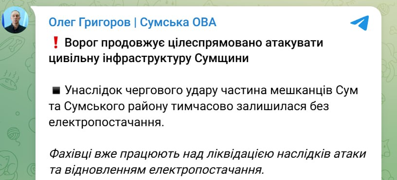 Из-за атаки Сумы и часть Сумского района остались без электроснабжения,