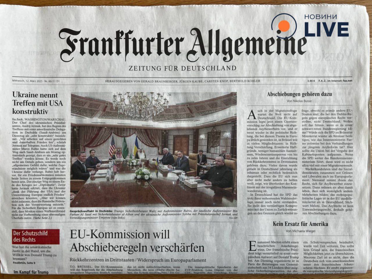 Первая страница авторитетной немецкой газеты сегодня посвящена результатам переговоров украинской и американской делегаций в Саудовской Аравии.