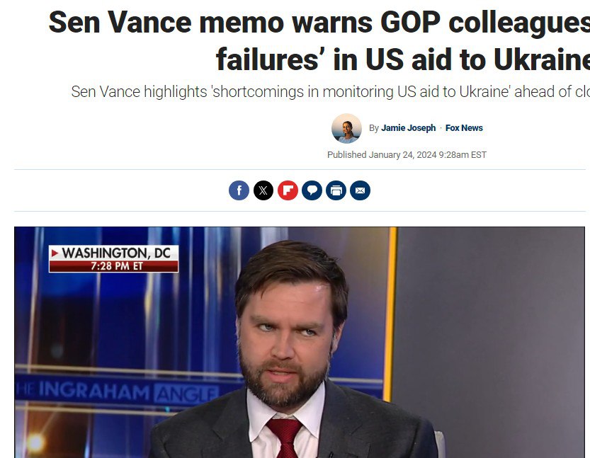 Американский сенатор Джеймс Девид Вэнс в преддверии заседания республиканцев по Украине направил коллегам по партии записку, в которой напомнил законодателям о недостатках в отслеживании американской помощи Киеву, подробно описанных в последнем докладе Министерства обороны США.