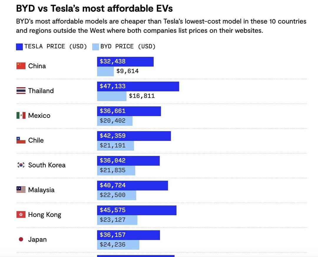 Во всех странах, где Tesla конкурирует с BYD, китайские электрокары значительно дешевле аналогов от Маска. Наиболее заметна разница в Таиланде - Model 3 дороже на $30,000.
