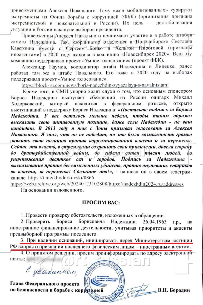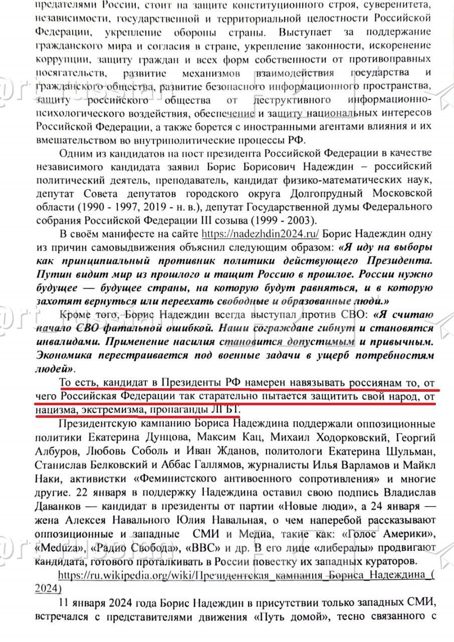 Кроме того, Бородин приводит факты взаимодействия штаба Надеждина с представителями команды Навального (включён в реестр причастных к терроризму и экстремизму) и его участия в совместных с экстремистским ФБК мероприятиях.