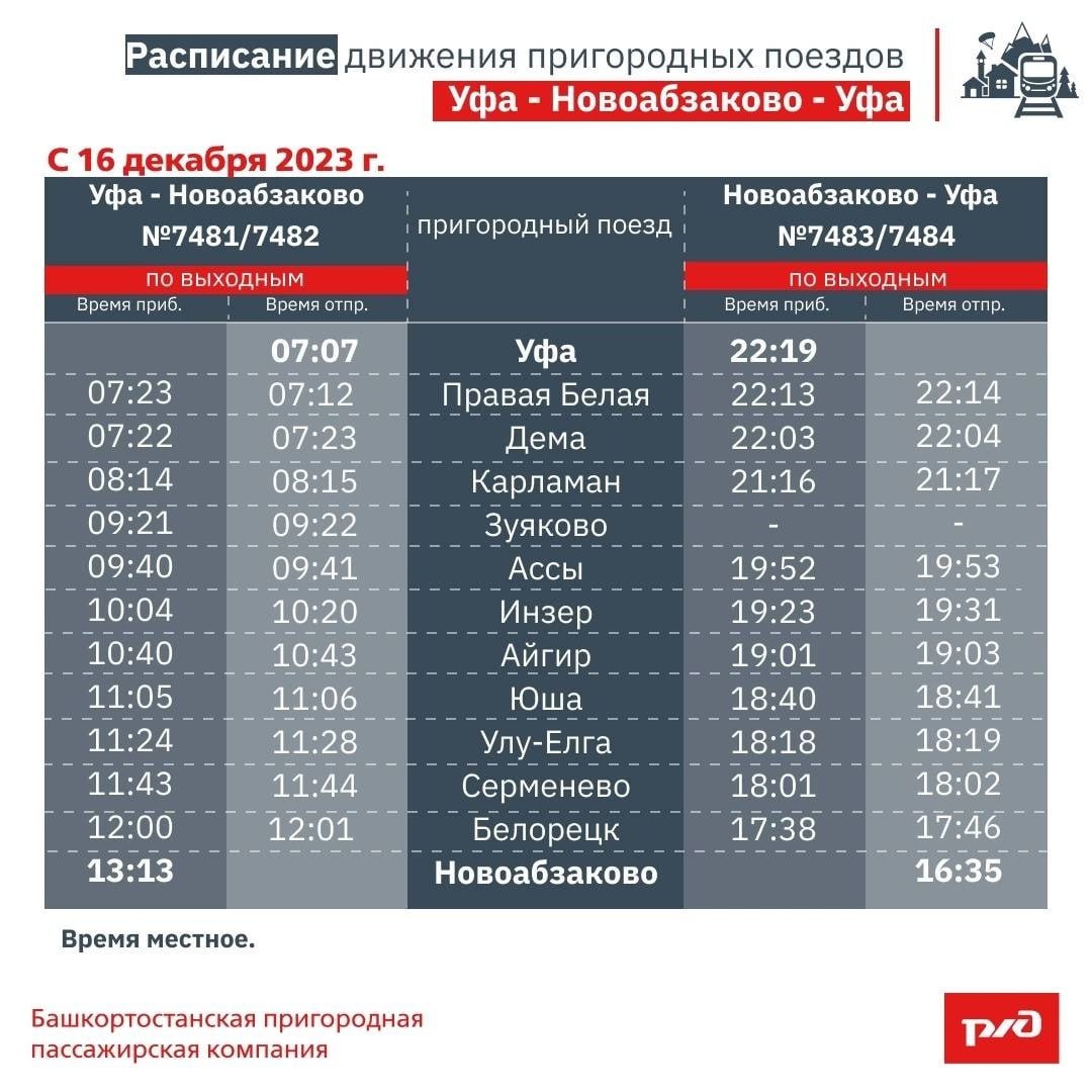 № 7483/7484 отправление от Новоабзаково в 16:35) — в Уфе в 22:19
