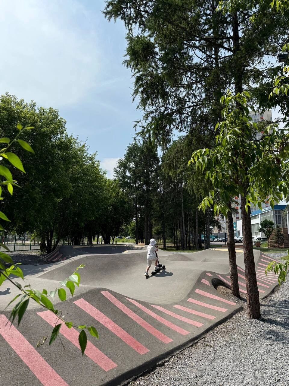 Потом отправляемся в активити-парк: там есть памп-трек для самокатчиков, рампы для экстрима, баскетбольная площадка.