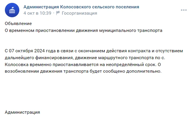 На странице администрации Колосовского сельского поселения во «ВКонтакте» появился пугающий пост о том, что движение муниципального транспорта приостановлено. По этой информации, жители района не могут уехать уже три дня. Причина — в муниципальной казне закончились деньги для обслуживания транспорта.