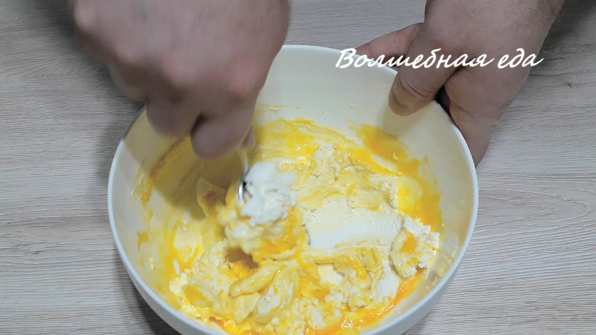 Выкладываю в чашу творог и добавляю яйцо. Солю и тщательно перетираю все ингредиенты.